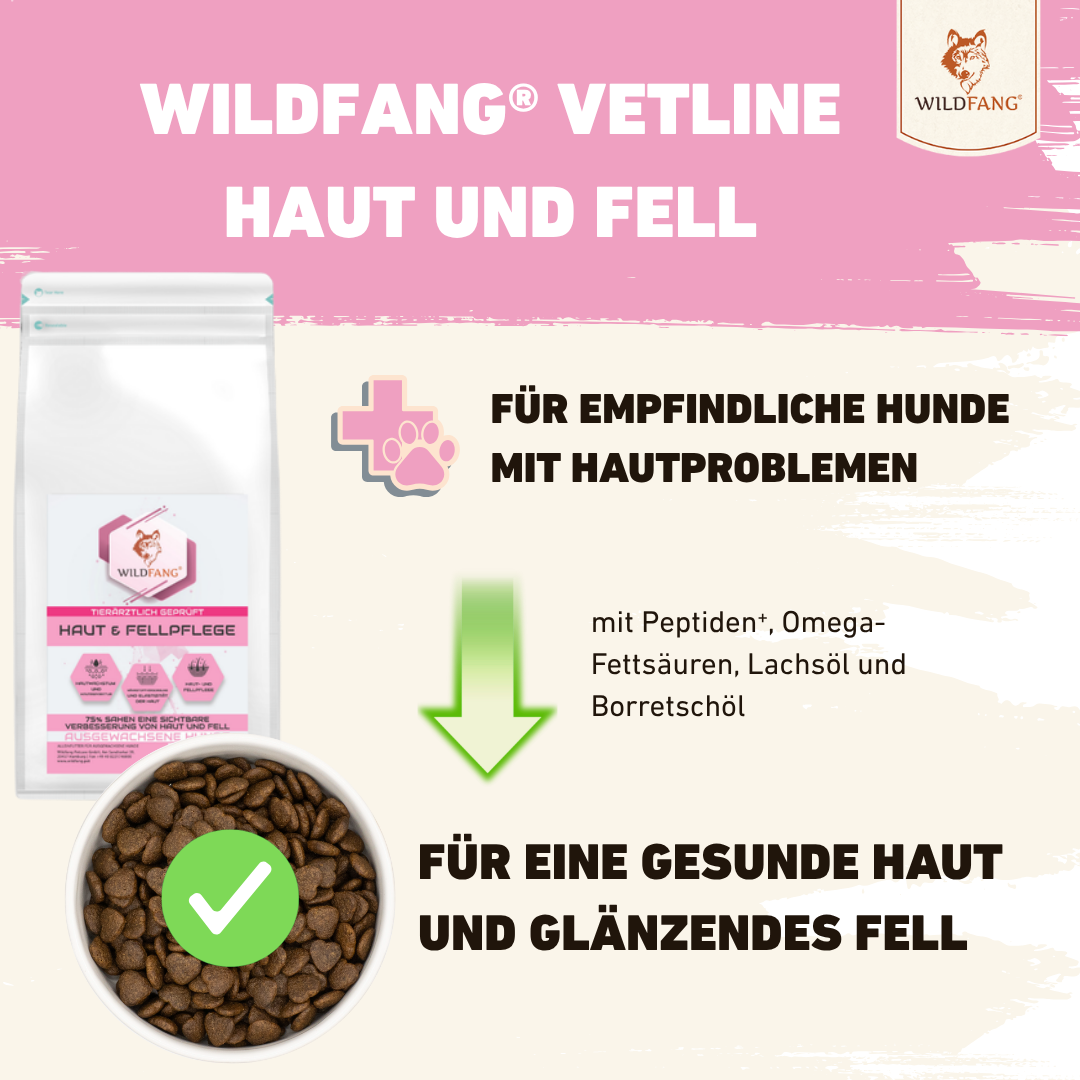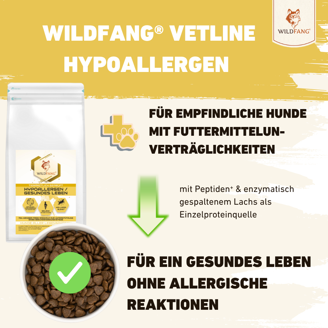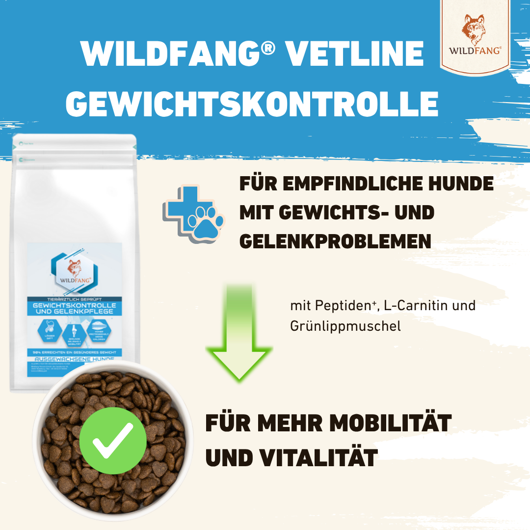 Unsere neue Wildfang® Vet Line wurde gemeinsam mit Tierärzten entwickelt und gezielt auf die besonderen Ernährungsbedürfnisse sensibler Hunde abgestimmt. Ob Verdauung, Haut, Gewicht oder Gelenke – jedes unserer vier Premium-Diätfutter bietet eine wissenschaftlich fundierte Lösung für spezifische Herausforderungen im Hundealltag. Alle Rezepturen basieren auf enzymatisch gespaltenen Proteinen (Peptiden), die eine besonders hohe Verdaulichkeit und Verträglichkeit garantieren. Durch den Einsatz ausgewählter, hypoallergener Zutaten, den Verzicht auf Getreide und künstliche Zusätze sowie eine schonende Herstellung unterstützt die VetLine aktiv das Wohlbefinden deines Hundes.