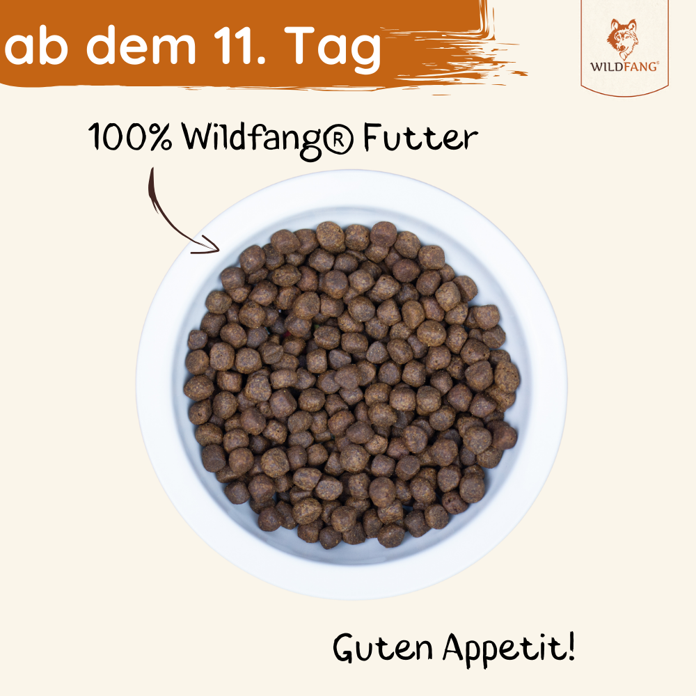 To ensure the transition to our Wildfang® premium food goes smoothly, we've compiled some helpful tips for you. It's important that you give yourself and your dog time to do this – we recommend switching the food within 11 days. If your dog is particularly sensitive, allow a few more days for a gentle transition to the new food.