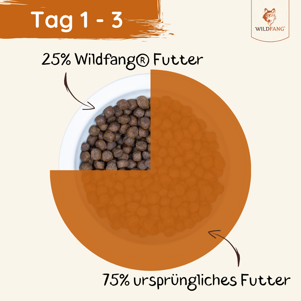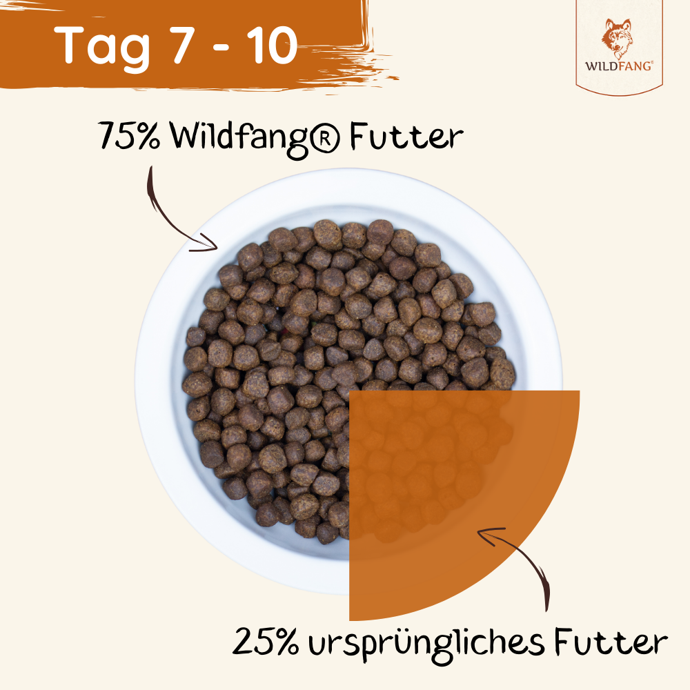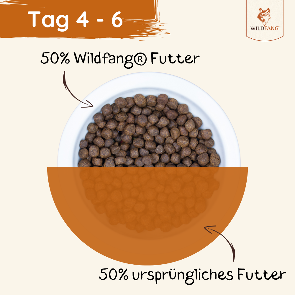 Tip: Our premium food is very well tolerated, but not every dog is the same. If your dog is having difficulty, simply extend the transition period by gradually increasing the amount of the new Wildfang food over a longer period of time, giving your furry friend more time to get used to the new food.