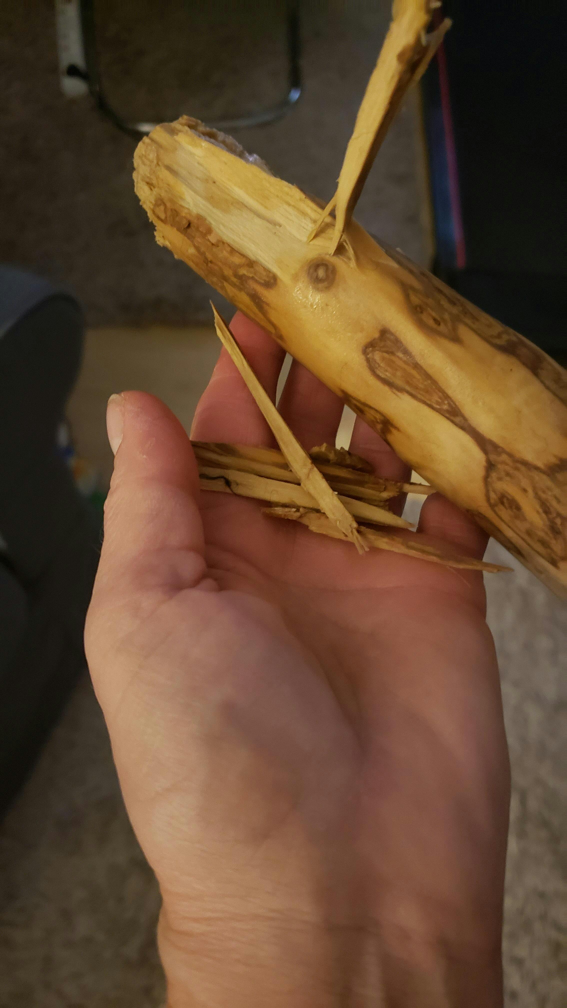 Also nach 5 Minuten sah das Kaffeeholz mit Lachsöl so aus( siehe Foto).Freu mich das er überhaupt drauf rumbeisst...aber das es so schnell splittert dachte ich nicht....es sind grosse hrobe Splitter( Amore ist ein 3 Jahre alter Gordon Setter Mix mit normalen Zähnen).Mal gucken wie er es die nächsten Tage benutzt.